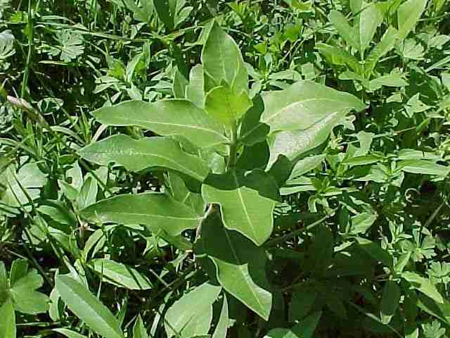 Photos and website by Harlen E. and Altus Aschen Copyright (c) 2001 May be reproduced and used for educational purposes. Data: Monarch Watch milkweed guide Asclepias viridiflora: What we have seen: flowers are tightly packed in their umbel clusters (usually tilted downward) ... lime green or yellow-green reflexed petals ... the five purple hoods are tight around a taller central column the color of the petals ... central column has frilly, almost white tips ... deep green leaves are broad, ovate but usually pointed, wavy edges, some very waxy and shiny, showing many close veins, short petioles. We have found viridiflora in DeWitt and Bexar Counties in Texas. |